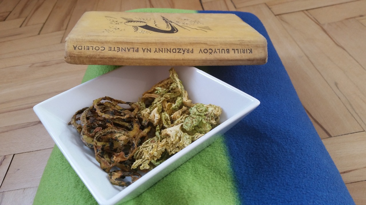 Varený kelový prívarok alebo kelovú polievku nemám práve v obľube. Kel som zvykla kúpiť v naivnej predstave, že si ho odšťavím ako vitamínovú bombu. Obsahuje totiž množstvo aminokyselín, vitamín C, E a vitamíny skupiny B a aby toho nebolo málo, tak aj minerály draslík, sodík, zinok, železo, mangán a iné. Lenže zatiaľ som kelu v štave ešte na chuť neprišla, takže zväčša skončil zvädnutý a polomŕtvy v koši. A potom to prišlo. Keď som raz zakopla do večne sa u nás povaľujúcej a pustenej sušičky, od bolesti som sa zmohla akurát na: "Do kelu". A už to bolo. Usušila som si kelové čipsy, zakryla sa teplou dekou a vychutnávala ich pri obľúbenom románe z detstva (na fotke s paprikovými čipsami).